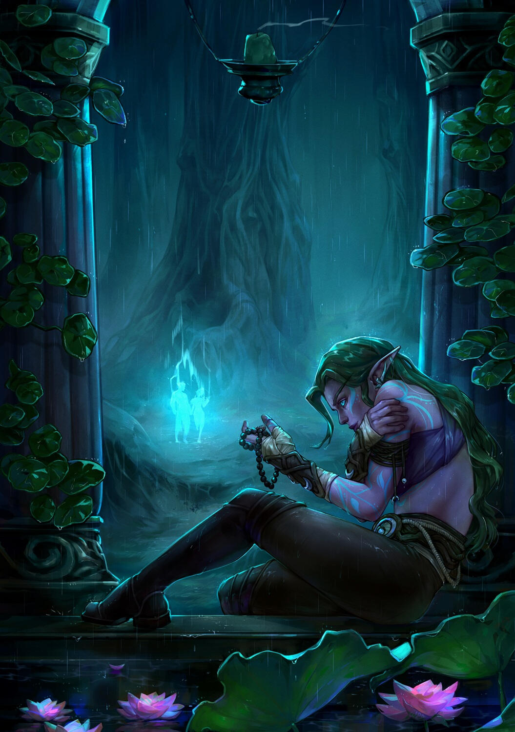 The only sound Sylvari could hear was the irregular drip of the orcish blood falling from her fingers to the forest floor. Clasped in her other hand were her prayer beads, old, worn and until recently adorning her neck, before the mangled orc at her feet had unceremoniously tugged them off in her death throes.She wiped her gore-covered mouth with her hand, effectively smearing even more blood across her face. The green-haired druid did not seem to notice, though, eyes transfixed on the beads in her hand, as her mind started to replay events of centuries past.The young night elf found herself falling forward as the massive nightsaber pounced on her from behind. Albeit late, instincts kicked in and she thrashed violently, trying to get the attacker off before attempting to strike back. Next thing she knew, though, coarse fur was replaced by warm skin and short white hair. She stopped her protests and relaxed her body, rolling her eyes.“An appalling performance, Sentinel Windsong. All that training, and a novice druid can incapacitate you so easily,” a mirthful voice spoke from behind her ear.“All that training and you would assume your teachers would impart some much-needed wisdom, as well!” Her words were slightly muffled by the grass, but she soon heard a hearty laugh erupt from her assailant, before he removed his weight from on top of her.Sylvari turned around and took the hand he’d offered to help her rise. As soon as she was on her feet, though, he tugged her close in a tight embrace.“I've missed you so much.” His breath tickled her ear as she pulled him even closer, her eyes squeezed shut to stop the tears of joy from escaping.“Kal, I-“ Sylvari pulled back to cradle his face in her hands, smiling. “I didn't think I'd see you for another year. How are you here?”He smiled, knowing the next news would please her. “Al'theas and I are travelling to several groves in this area. We don't have long, we’re only stopping for a few days.”The young woman grinned brightly. “Dad is here too!” she said, excited.“Thought that would make you happy.”“Not as happy as this,” she whispered cheekily and stood on her tip-toes to press their lips together, hands now playing with the prayer beads around his neck.An ugly grimace made its way onto her tear-streaked face as Sylvari’s eyes focused on the corpse in front of her. The orc was wearing furs and leathers, quite fresh by the smell of them. A crude bow lay broken next to her mangled body. A hunter, by the looks of her. Alone? Perhaps not. She was not carrying any large satchels, so her camp must have been close. And orcs did not venture this far into Ashenvale on their own, war or not. As her golden eyes followed the obvious trail left behind by the hunter, Sylvari’s brows furrowed even closer together. She knew what one might find in that direction, and judging by the presence of the prayer beads, it was the logical deduction.Suddenly, after what felt like ages of inaction, Sylvari clasped the prayer beads behind her neck, and headed down a path she had not walked in decades...
