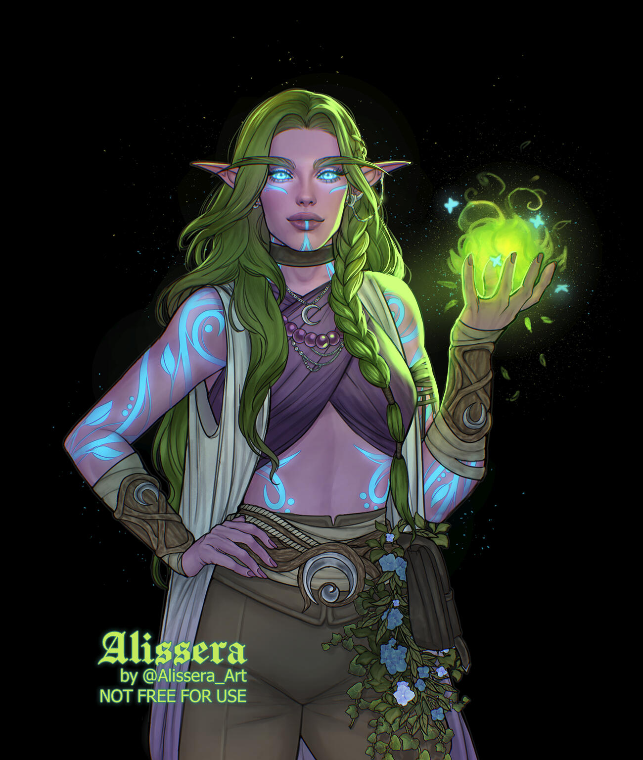 An Ashenvale elf, Sylvari has suffered much at the hands of the Horde. Her loss, grief, and anger turned her into an instrument of retribution for the Kaldorei people, leading to her banishment after succumbing to the allure of vengeance. With innocent lives weighing on her shoulders, she found an unlikely home with a company of adventurers determined to leave Azeroth better than they found it. Once seeking only to avenge her fallen kin, she now finds the protection of her friends to be her purpose, the bonds she forged within their midst inadvertently leading her down the path of redemption, as unworthy as she judges herself.