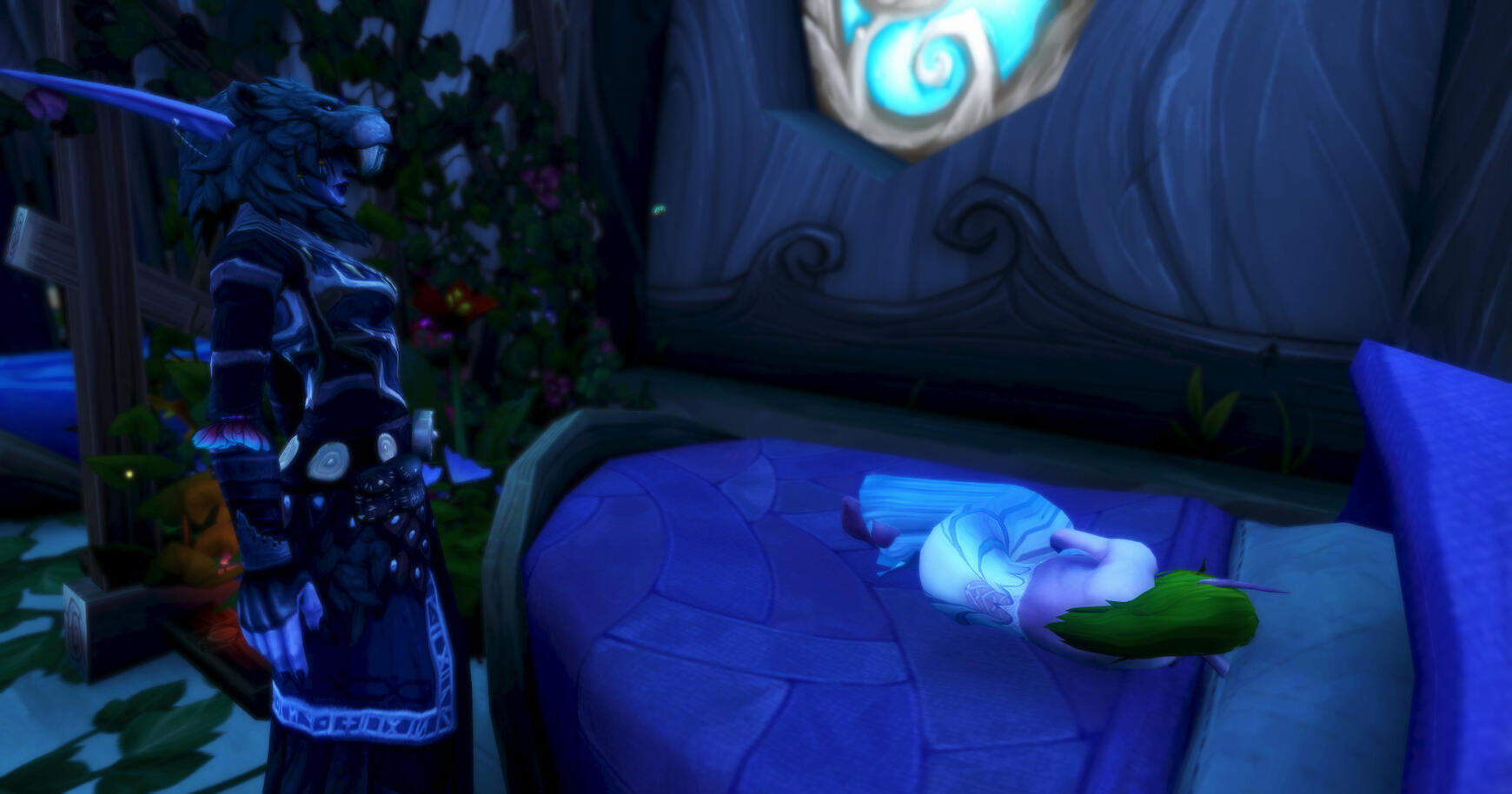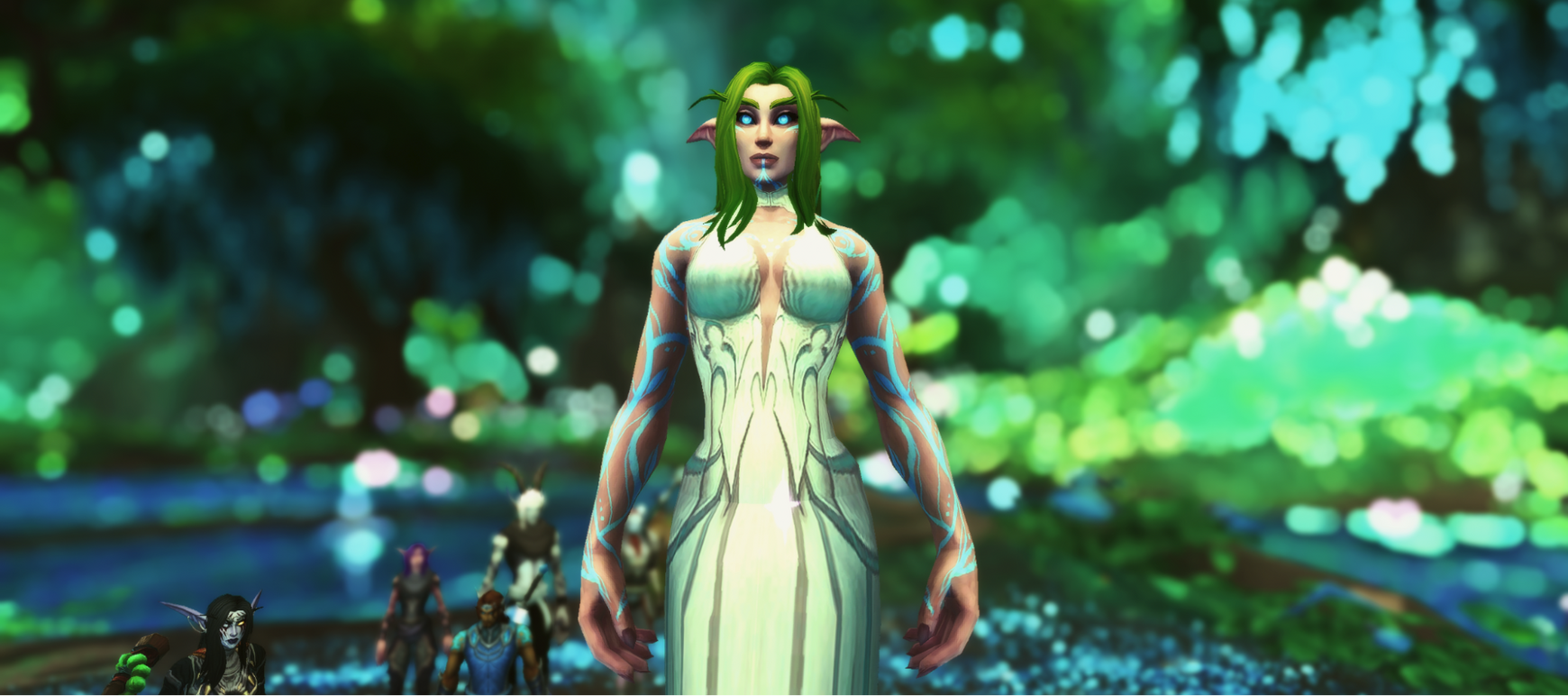 While in Moonglade for the annual Lunar Festival, Sylvari fell into a deep sleep from which she could not be awakened. Mythos ventured into the Emerald Dream to rescue her, bearing witness to some of her most painful memories - the realisation Kaledas was undead, the raid on an orcish settlement that convinced her to desert the Moonshadow Sentinels, her father's death on the slopes of Mount Hyjal as Shan'do Malfurion sounded the Horn of Cenarius. Eventually, they found her in a small grove, where the last memory played over and over: a stillborn, Sylvari had been brought into the Dream by her father, to be resurrected by Q'onzu. The wild god accepted, in return for her father's life once she came of age.It all made sense now, her erratic connection to the Dream, her newfound powers. But Sylvari needed the final push in order to come to terms with her trauma and embrace her identity. Mythos was there to provide that push, reminding her there are many who care about her in the waking world, a found family who would suffer in her absence. She accepted her past, and took the first steps into a hopeful future with Q'onzu's blessing, the new tattoos on her body now marking her as one of the Loa of Change's proteges. What that would come to mean, only time would tell.Mythos went on to embark on more adventures, with Sylvari's powers now finally under her control, albeit vastly unexplored...