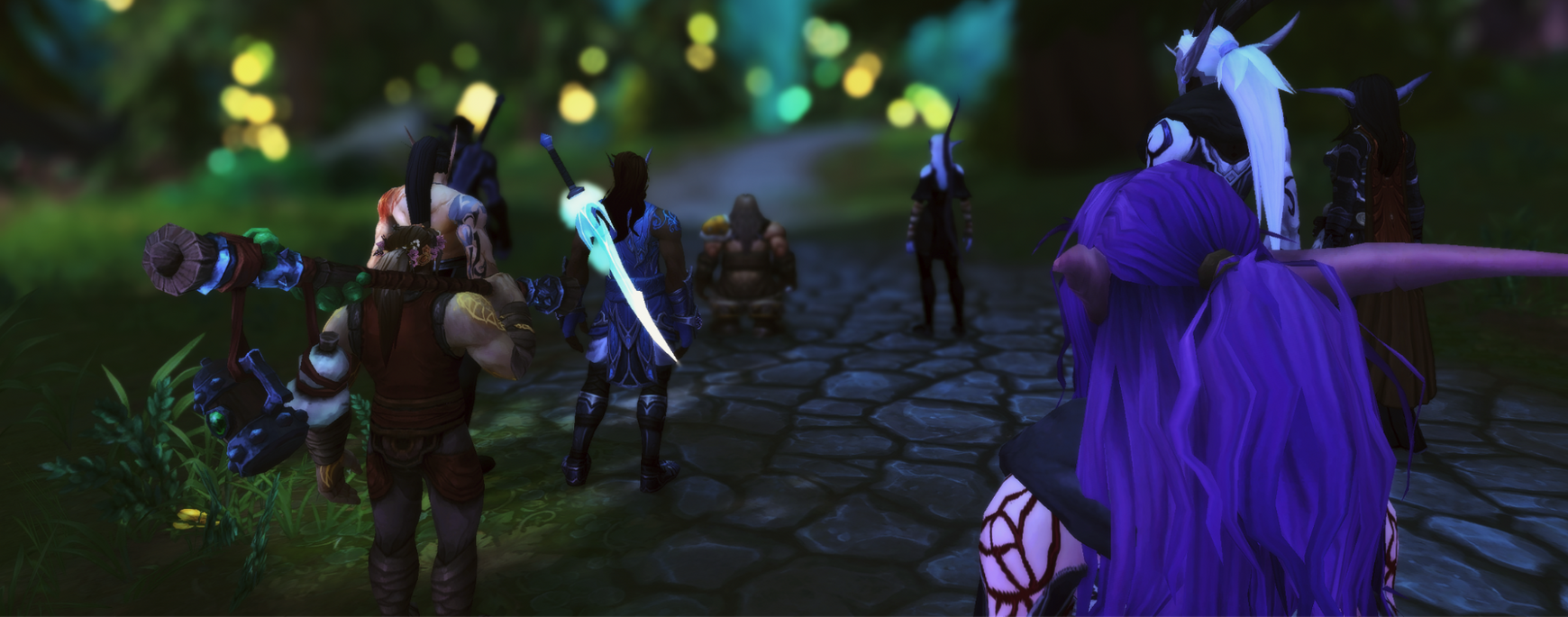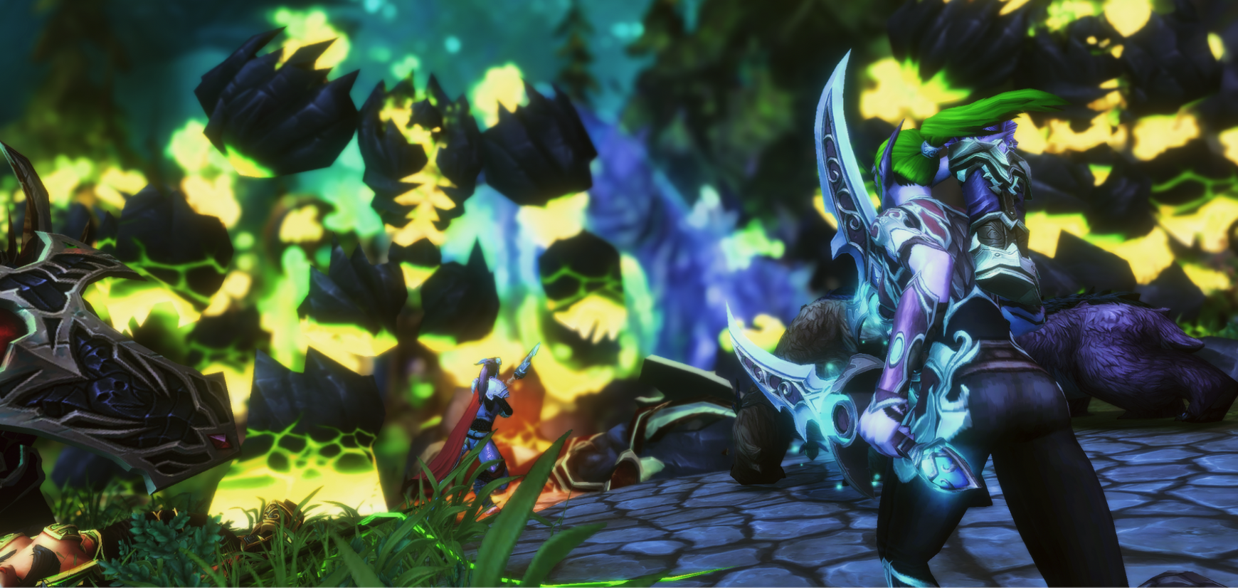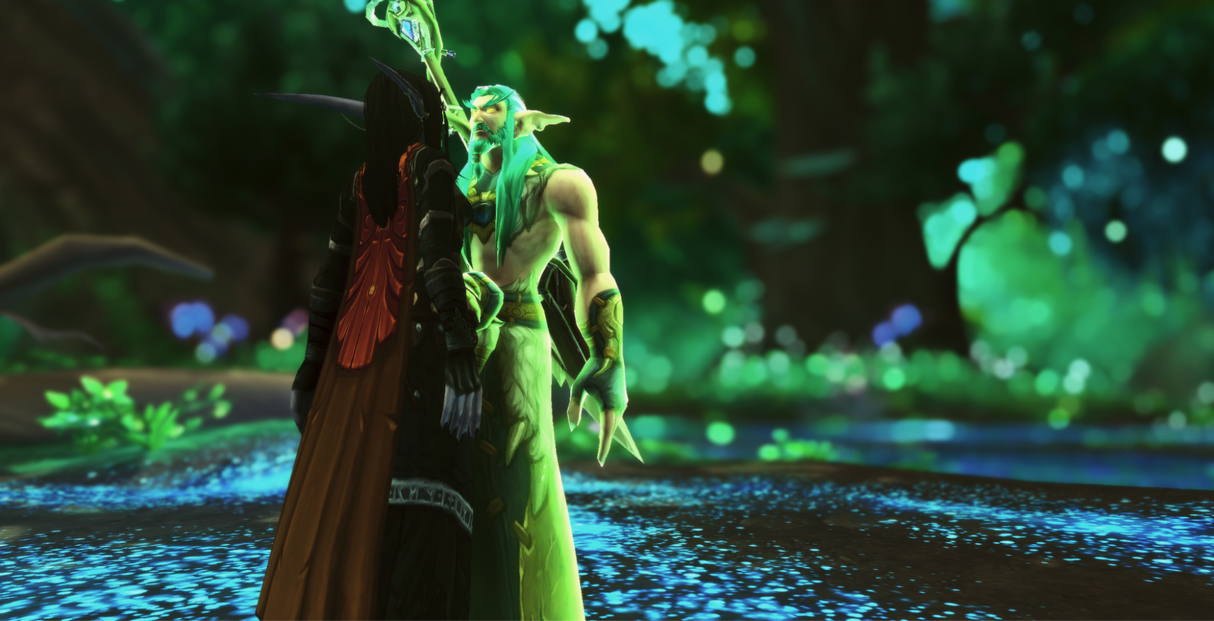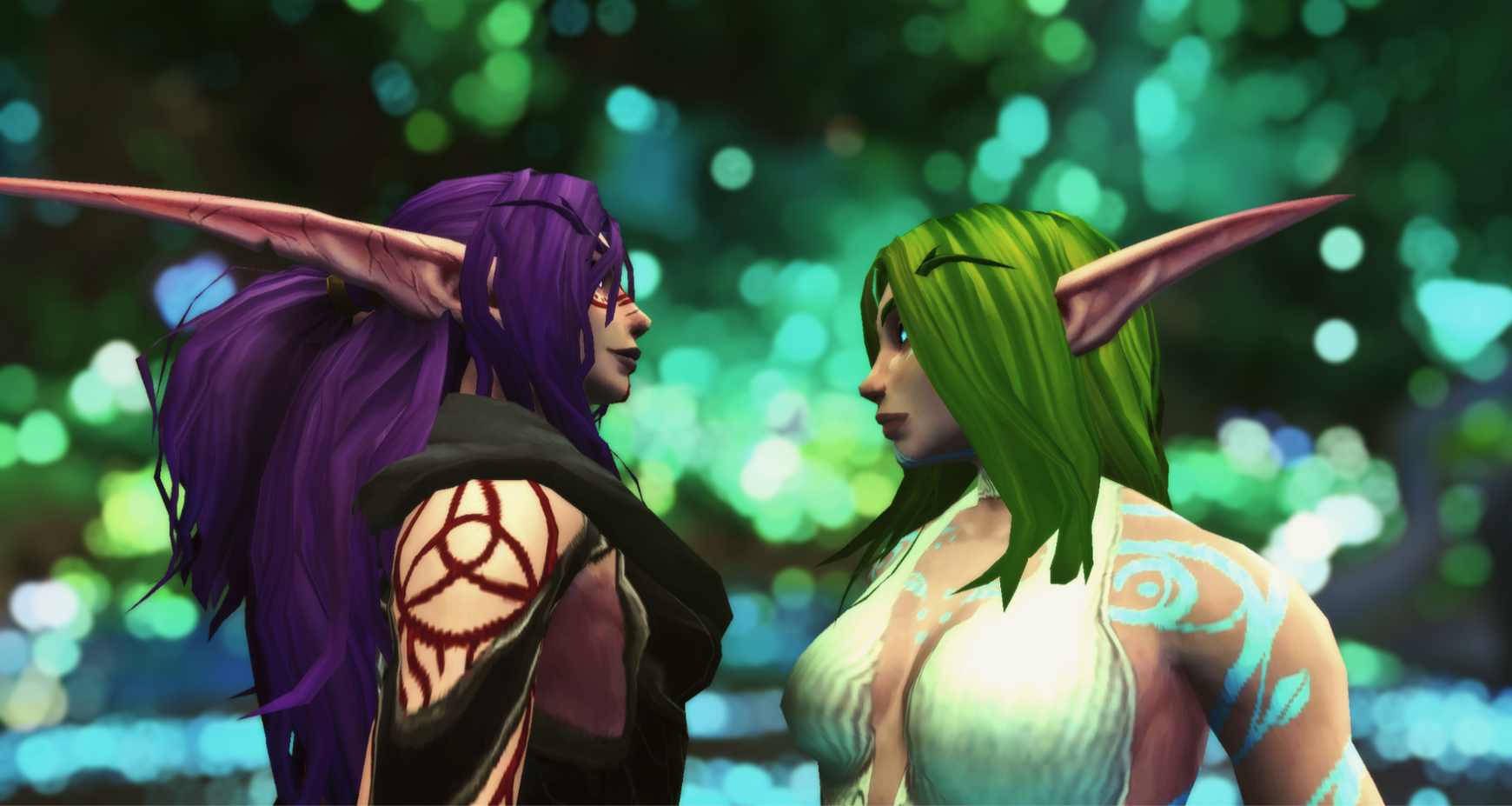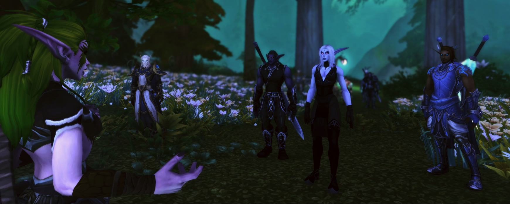 Kalendil huffed as she used her staff to help her navigate the forest floor. Months of being practically cloistered up at the temple had not helped her stamina, and she was out of breath after mere minutes of walking. She looked at Sylvari and Mythralis. The two did not display any signs of fatigue, they were alert and looked ready to spring into action at any time.“Long time since we were climbing trees near the grove, eh, Kali?” She heard Sylvari’s voice, followed by the druid’s usual subdued chuckle.“Shush, you,” she replied, between increasingly larger gulps of air. “It sounds like you two have been chasing this one for a while. What’s the story?”Mythralis took to answering the question. “I came across her a few months ago, in Feralas. I was sent to investigate strange happenings near Dream Bough. Although I do not know what her intent was, it was clear she was trying to do something to the dream portal. I thought I could handle her alone, but I barely escaped with my life.” She cleared her throat, and adjusted the strap holding her bow in place. “The minions of the void are slippery, so I decided I needed help. Luckily, I came across Sylvari in Feathermoon Stronghold, and enlisted her help,” she said, in a matter-of-fact voice.“Imagine my surprise when I saw dear mother – whom I’d believed dead after Teldrassil – alive and well in Feralas, asking for my help, of all people,” Sylvari said, interrupting her.“Your rudeness does you no credit, daughter. In any event, the second attempt failed as well. She slipped through our fingers, using illusions and shadow magic to trick us. I kept an ear to the ground since, and then I heard about the void manifestations in Val’Sharah.”Kalendil shuddered. “To think one of our own would be capable of such a thing. I would never have imagined it.” She frowned, and continued. “Is she Twilight’s Hammer? I thought they were all vanquished.”“We found evidence in her camp that seemed to indicate that. Or at least a powerful devotion to the Old Gods,” Sylvari replied.“Goddess. Do you think she’s trying the same thing here? Shala’nir is certainly close to the Dreamgrove.” Kalendil bit her lip, breathlessness momentarily forgotten as she pondered their enemy’s intentions.“It’s highly likely, yes,” Sylvari said.“I believe you will be the key to defeating her this time, Kalendil. A minion of the Old Gods is surely no match for the Goddess’ light.”Kalendil exchanged a look with Sylvari. Some things never change, it seems, and the old sentinel’s faith was one of them.