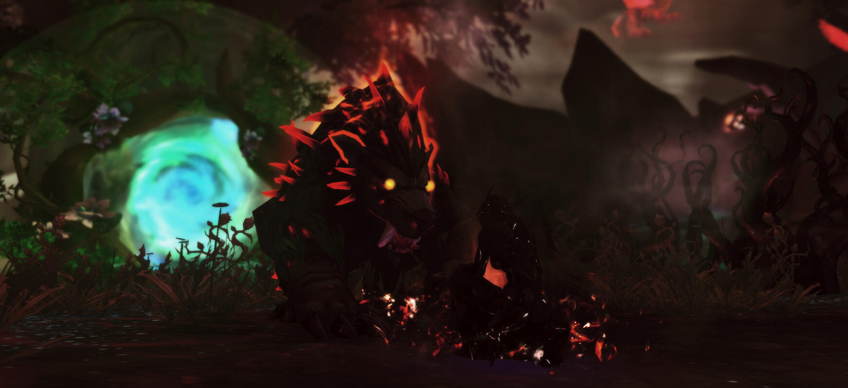 The group entered the heart of the labyrinth and approached the barrier protecting the verdant portal against the Nightmare's corruption, Luynaraeth in the lead. As she got close to the portal though, the Nightmare seed implanted in her soul finally bloomed. In the throes of agony, Luynaraeth raised a great wall of thorny brambles around her before the seed erupted out of her in the most literal sense. It grew to such proportions that her body could no longer contain it, a ball of putrid flesh bursting forth from the druid’s chest with a sickening crunch, mangling it. The ball hovered for a moment in front of her before it expanded, soon turning into a massive Nightmare bear - a physical manifestation of the corruption inside Luynaraeth's soul.