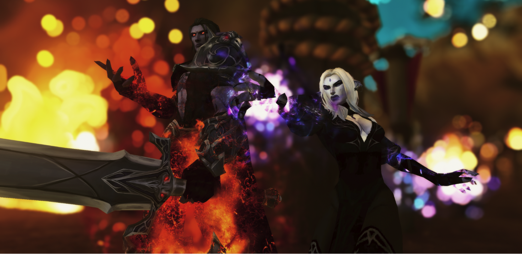 Sylvari shifted back into her elven form, and stood up from on top of the dead orc. The blood she got on her muzzle as a saber was still there after shapeshifting, making her face a gruesome sight covered in blood and gore. She spat and wiped her mouth with a cloth from her satchel, and took a moment to calm down and observe her surroundings.The fire light cast long, flickering shadows on the ground and tree stumps around, bathing the glade in an eerie glow, complementing the atmosphere perfectly. Even the orcs’ best efforts could not fell the largest and most ancient of the trees around the former grove, whose canopies still managed to conceal most of the sky. Through the distant branches, however, only clouds could be seen, the Moon and stars remaining hidden. Oddly fitting, the druid thought, as she closed her eyes and took a deep breath.Her feet started carrying her to one of the largest of the massive trees, her hand caressing its bark upon reaching it. She circled it, and sat down between its great roots, letting herself be enveloped in the memories invoked by that particular place.It was a beautiful night. Elune’s light shone through the small openings in the canopy, creating brilliant beams shining throughout the trees. The only sounds were the distant rushing of the nearby stream, the gentle wind brushing the leaves, and a few nighthawks trilling their songs in the branches above.Strong arms encircled her frame as she leaned back into her lover’s embrace, the both of them tucked and hidden between the roots of the enormous tree. It had been a lovely few years, even in the aftermath of the battle of Hyjal, and this time, it would be her leaving tomorrow. She tried to enjoy it while she could, her eyes lightly shut as she played with one of Kaledas’ hands, which she had taken hostage. She couldn’t help herself from asking again, though.“Are you sure you can’t come with me to Moonglade? You could help me with my training, keep me out of trouble?” She craned her neck to look at him, a pleading look in her eyes.“I'm needed here for the moment, unfortunately. I'll join you as soon as I can.” His voice was muffled, his face buried in her hair.She sighed, but fell silent again, her fingers entwining with his as they enjoyed the peaceful night. Before long, though, Kaledas turned her to face him, a timid expression gracing his normally confident features. Sylvari caught his eyes, one eyebrow quirked in amusement at his antics.“Saber got your tongue?”“Will-“ He cleared his throat. “Look. I wanted to ask... when I do get to Moonglade... I- I just never want us to be separated again.” He finally got the words out, unusually tongue-tied.“Oh, really? Sounds like a proposal, Silvercrest.” She smirked, hands clasping behind his neck and trying to pull him closer.He resisted the tug. “What I meant was… I want to spend the rest of my life with you, and only you. I love you. And I always will.”The teasing mirth vanished from Sylvari's face, replaced by sudden tears welling in her eyes. He really was proposing. How could she refuse? “And I love you, dalah’surfal. I always will.”