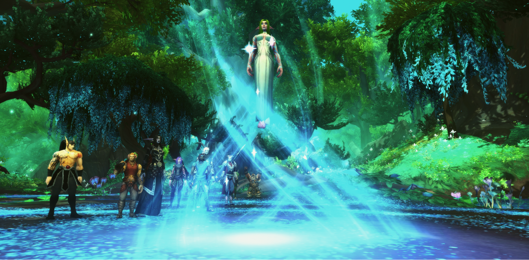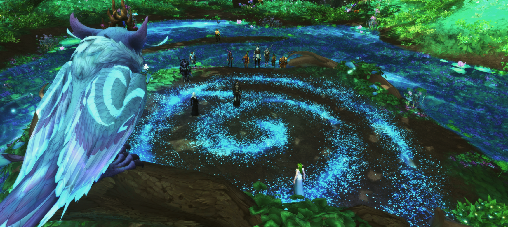 Mere moments later, Malfurion Stormrage sounded the Horn of Cenarius elsewhere in Hyjal, summoning the elves' ancestors from their slumber. Thousands of wisps arose from the forests around them, flying toward Nordrassil above. Zerathul looked up and pulled his army back, disappearing through a portal. For Mythos, the memory faded, their vision going dark once more.